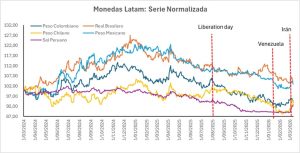 Sin embargo, este no ha sido el único choque externo al que se han enfrentado las monedas de la región durante el último año. En 2025 el llamado “Liberation Day” y el ruido alrededor de los aranceles marcaron gran parte del panorama internacional. El inicio de este año, además, trajo un cambio importante en la estrategia de política exterior de Estados Unidos, con una aproximación más directa, evidenciada en la extracción de Nicolás Maduro del poder en Venezuela y el bombardeo en Irán.