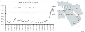 Esto llevó —como se observa en el gráfico 1— a un aumento drástico y acelerado en los precios del crudo, con la referencia Brent cerrando en US$118 por barril, un 63% por encima de los US$72 registrados al finalizar febrero, antes del inicio de los ataques. Sin embargo, también es evidente una corrección cercana al 20%, impulsada por la tregua de dos semanas acordada entre Irán y Estados Unidos el pasado 8 de abril y la expectativa de reapertura del estrecho.