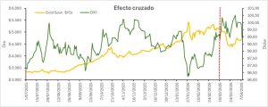 El 28 de enero de este año, el oro alcanzó un máximo histórico de US$5.417 por onza, reflejando un fuerte impulso alcista. Sin embargo, en marzo cayó más de mil dólares —cerca de un 19% en pocas semanas—. Aunque los conflictos geopolíticos suelen impulsar el oro como activo refugio, en este caso ocurrió lo contrario (como se observa en el gráfico 2), acompañado de un fortalecimiento del dólar. Esto puede explicarse por tres factores principales: